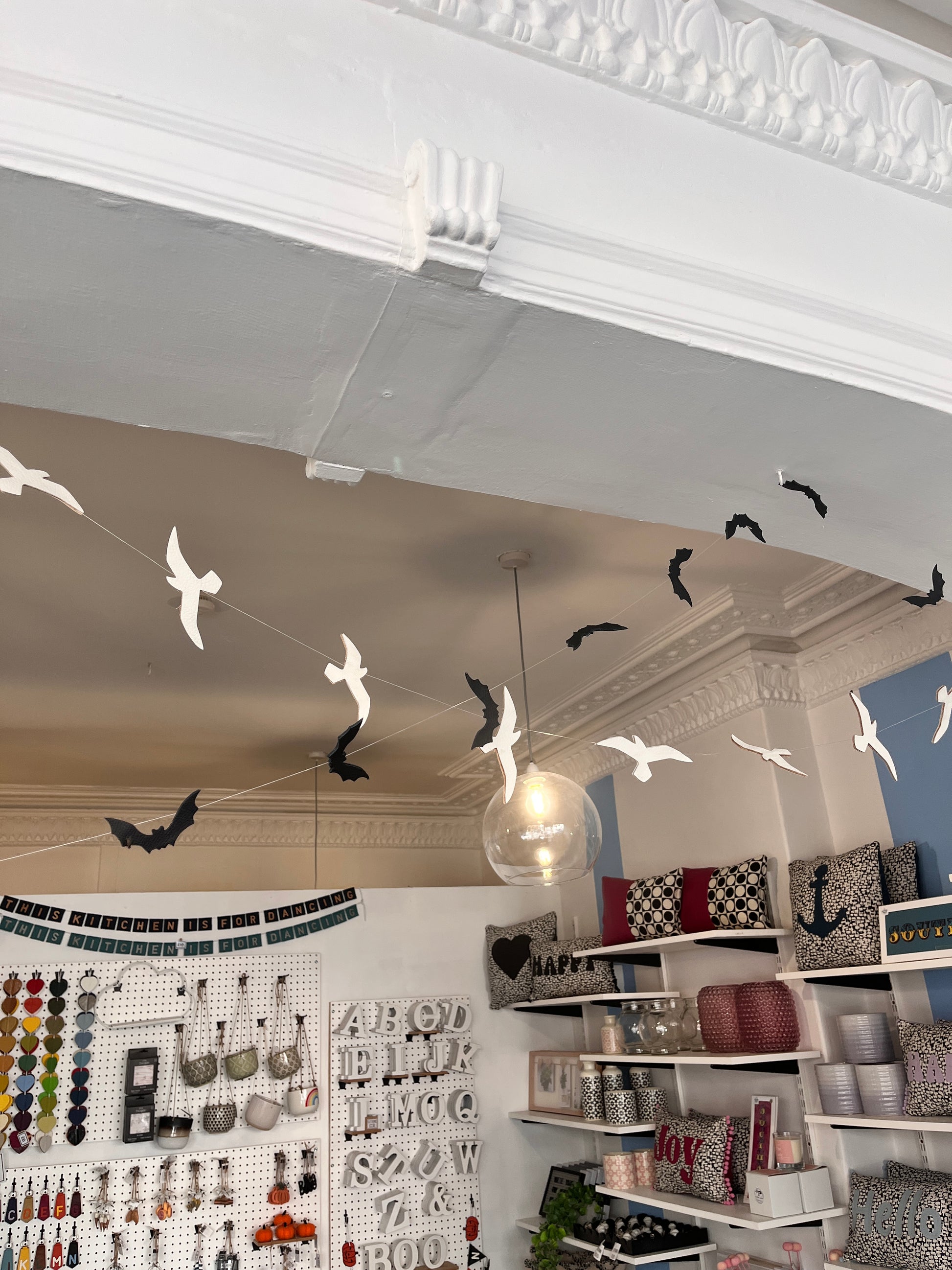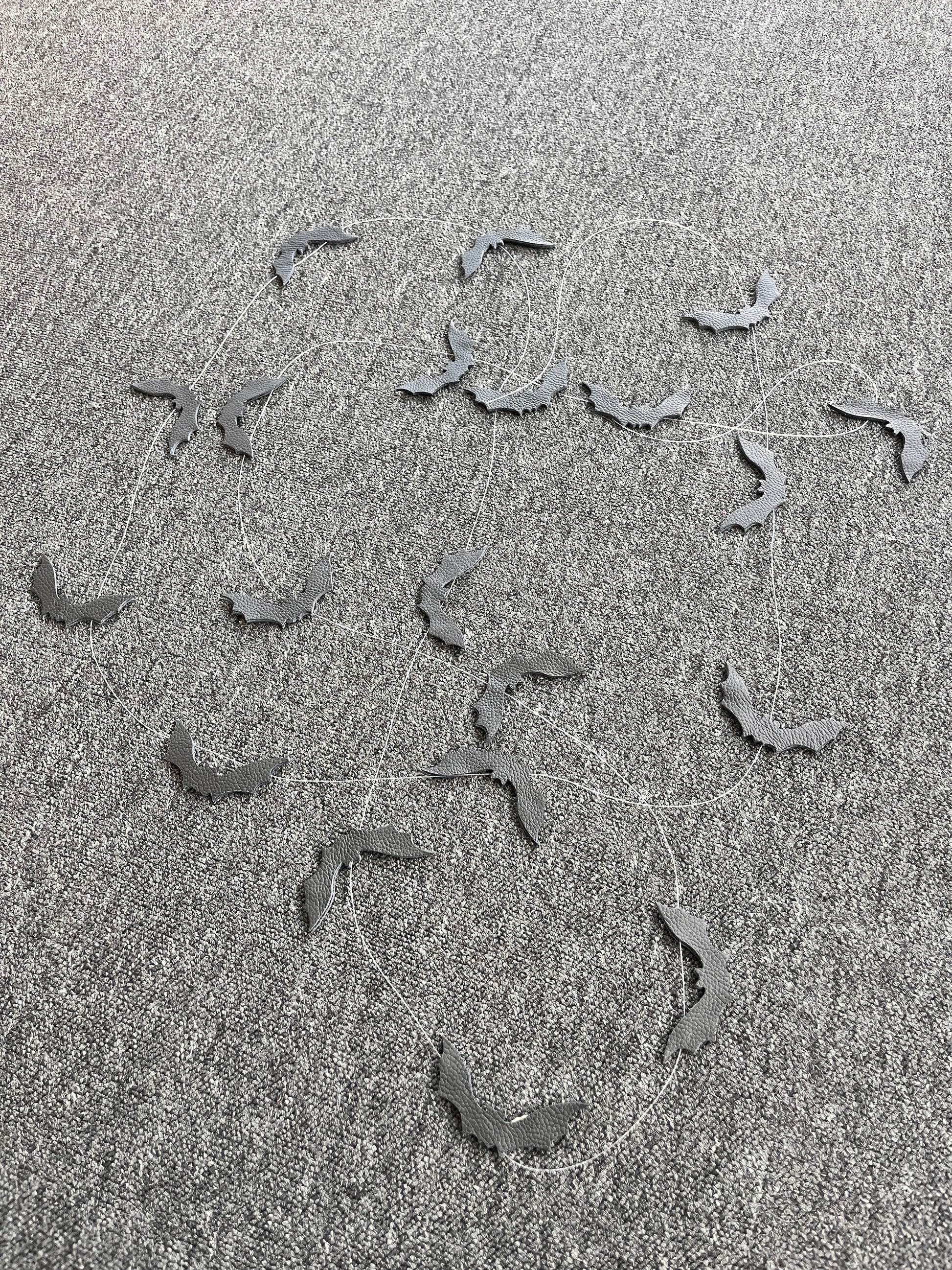 Leather bats on catgut (strong see through plastic) string. 30cm of extra string either end.